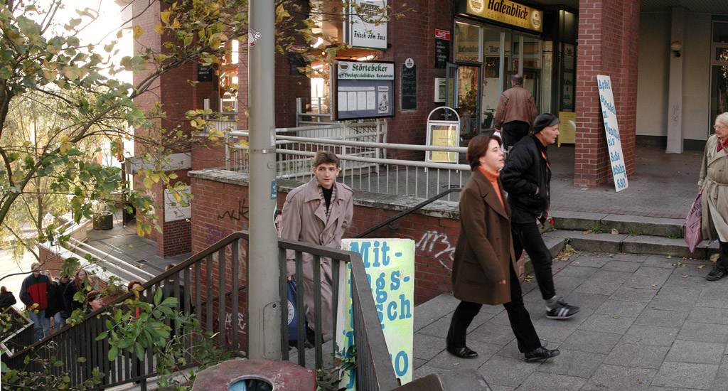 A range of 4 composites put together from 90 photographs, taken at the corner of Bernard-Nocht-Straße and Davidstraße, Hamburg, on the afternoon of Nov 3? 2000 within perhaps 10 minutes.