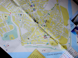 (1) A map of Conil, the one you get on the tourism office at the bottom end of Calle Carretera. Conil is situated some 35 km south-east of Cadiz. The nearest airport is Jerez. If you are a prospective tourist: Sorry there are no photos here of the nice parts (the old Guzman tower and the place in front of it, the old gate, the beach promenade and the sea view, etc. All this is nice enough, the centre is quite pleasant, without the huge concrete blocks like the ones you find at Torremolinos etc.)
