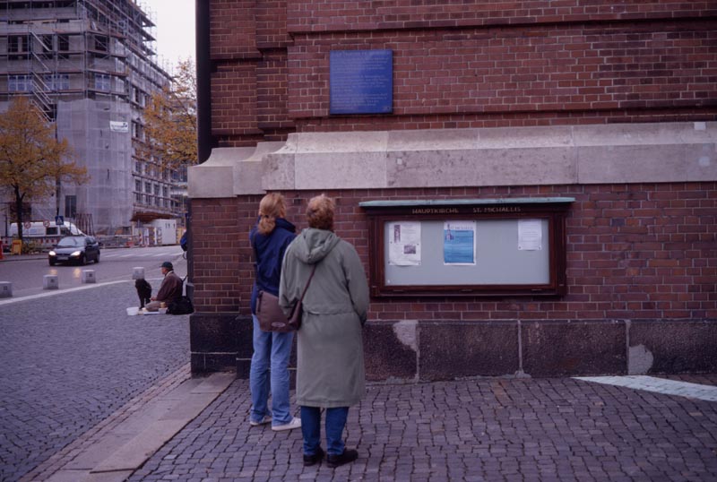 (1) The Michel (Hauptkiche St. Michaelis) is probably the best known tourist trap in Hamburg, in the line of tower bridge, tour Eiffel, World Trade Center. Busses discharge and pick up tourists. A first inspection yields a view of the side wall to the right of the entrance, showing a blue sign with a few details about the 'Michel'.