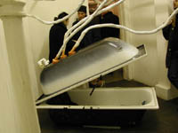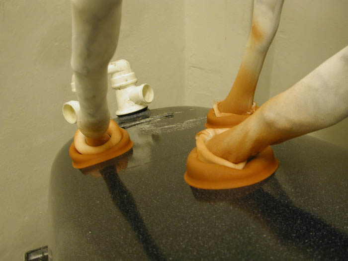 Tubes start at windows, walls etc. and wind their way to other walls and windows. A few of them end at the central piece of the installation made up of two used enamel tubs with hydraulic lid and leather cushion, an item which figures as a kind of relaxation chamber or deep-freeze container for light-years of travel. The upper tub has two plasic windows which offer a view of a polyptych of photos showing an underwater scene. Some tubes are linked together by an interface made up of two 'suckers' which rather look like synapses.