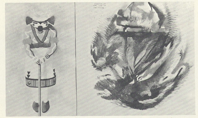 Unnamed artist: Indian doll representing a Hopi field deity, drawn before (left side) and during (right side) the influence of psychedelic drugs. Picture quotation from Masters & Houston 1969: Psychedelische Kunst.