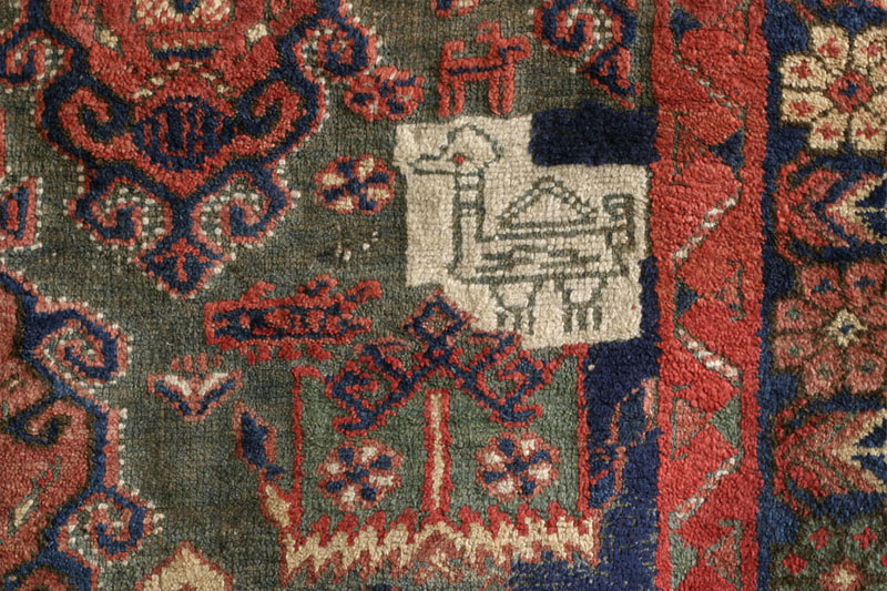 Eine rotgrundige Kartusche, am linken Rand um 90 Grad gedreht ist, enthält eine halbleserliche Inskription und anscheinend ein Datum, 1372; dies macht jedoch keinen Sinn, da es in unserem Kalender 1952 bedeutet, was viel zu spät wäre, während die Lesart 1855 AD sicherlich 40 Jahre zu früh wäre. Da Knüpferinnen häufig Analphabetinnen waren, gibt es in Stammes- und Nomadenteppichen häufiger sinnlose Daten. Interessant und ungewöhnlich das eingearbeitete stilisierte Kamel auf der linken Seite.