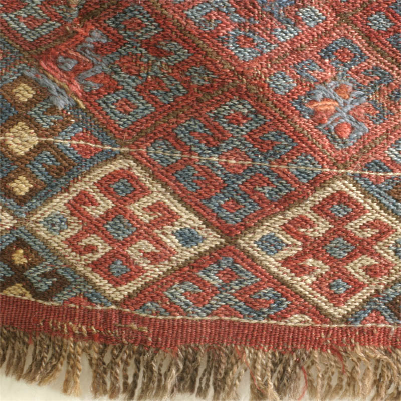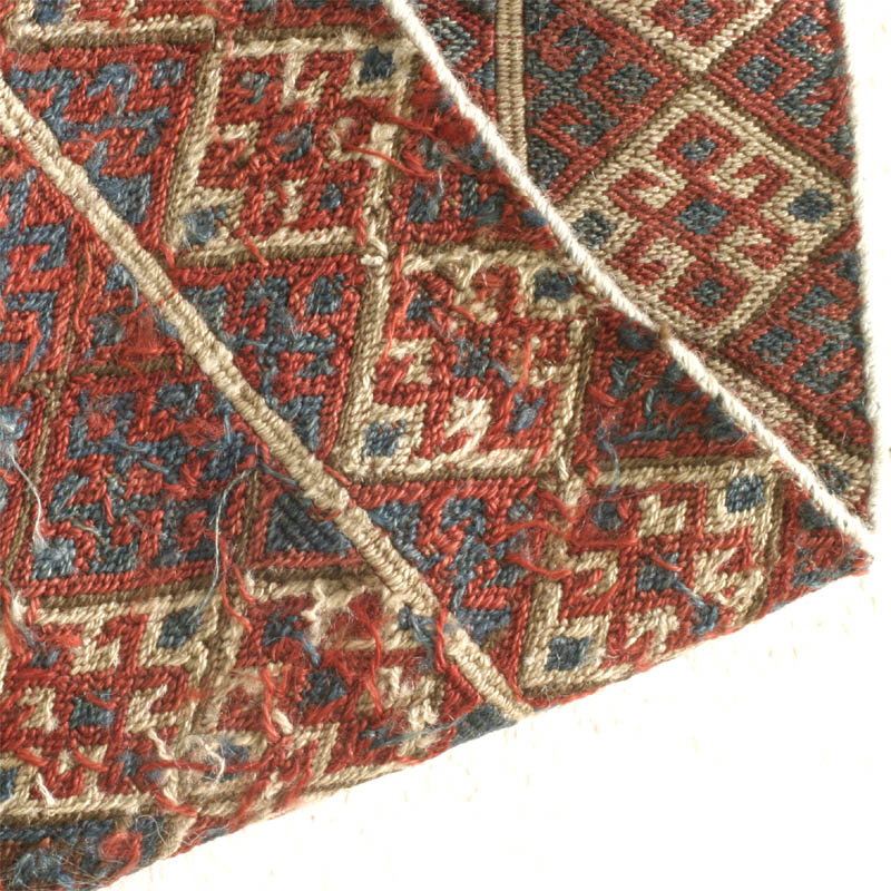The diamond with the stacked three diamonds inside, and a pair of hooks extending sidewards from the central diamond, is one of the most commonly used in NW Persia and Anatolia. The design with its diagonal contours is derived form structural necessities in flatweave techniques. It is also common, for example, in Jaff Kurd knotted khorjins.