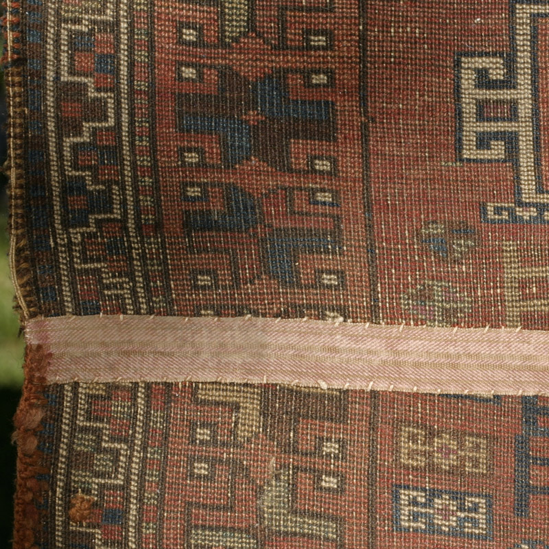Four medallions fill the rust-red field, the two inner ones enclose hooked rectangles, the outer ones diamonds. The pile is so long that the design gets a bid blurry. Interesting are the hooked line systems extending comb-like from the sides into the field.