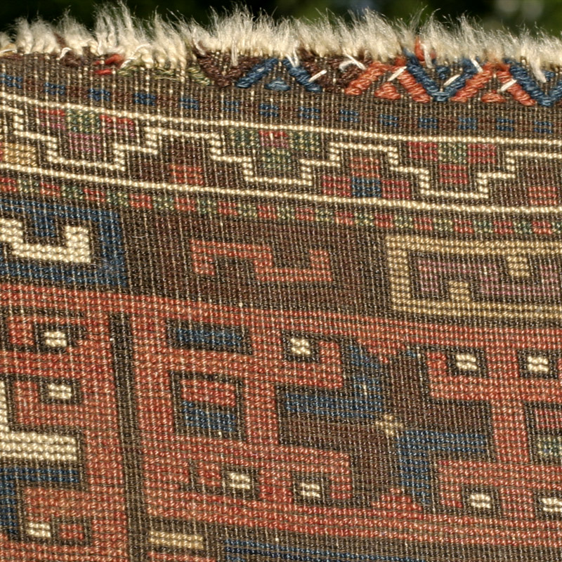 The rug measures 5ft.3in. x 3ft.3in. (160 x 100 cm). White to brown wool warps, three thin brown wool weft shoots. Symmetrical knots, 6.h,11.v = ca. 66 kpsi. Soft, full and extremely meaty handle. One kilim end shows red and blue weft fload brocading. Two cord selvage with herring-bone wrapping in two colours, in alternating bands about 7 inches long.