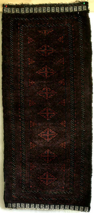 Endless repeat with squashed lozenges sporting four arrows pointing inwards and creating a cross in negative space. The aubergine space between lozenges is filled by an endless meander pattern, which is also used in the wider pair of borders. Particularly attractive are the flatwoven ends with a ramshorn motive inscribed in a rectangle, executed in weft-float brocading. Whether this bag face evr had a back and was actually made as grain bag or as bag at all, I am not sure. It does not show the characteristic wear, it certainly has never been used in a tribal context. May be it was produced as a dowry item. Very suitable as narrow luxurious rug for a small space - the full velvety pile is very nice to the touch.