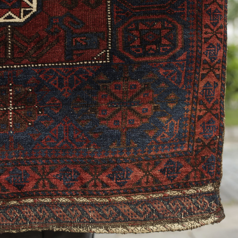This is a very large and somewhat sombre bag face, Khorassan Baluch type, possibly Timuri (compare it to a similar, sightly less squarish piece in Rippon Boswell's 2011 spring auction). Probably made around 1880-1910.
