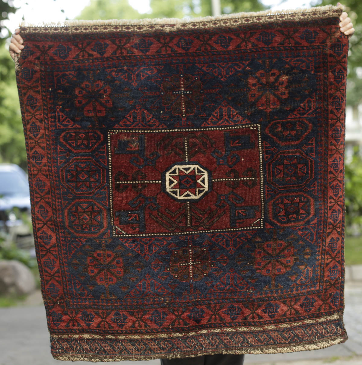 The bag face is square, the dimensions are 2.8ft x 2.8ft (86cm x 87cm). No warp depression, asymmetrical knots open to the left, a nice soft and flexible handle, shiny wool. Ivory wool warps, thin brown double wefts. The knot count is 36/10 cm vertical, 30/10 cm horizontal = 1080 knots per dm2. Translated into kpsi, this is about 9.v, 8.h = 72 kpsi.).