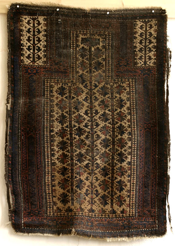 The spandrels contain small trees featuring the same bud-shaped forms on their branches, as well as the same tiny rhombic filler and fork-like flanking motives as the field. Halfway down, small ramshorn motives extend inwards from both sides. Many small variations (note for example the difference between the tree stems, crown, and filler motives of the spandrels) demonstrate the integrity of this piece, so it may not be one of the thousands of Baluch prayer rugs that have been produced for export. I guess this piece is quite early, from the second half of the 19th century.