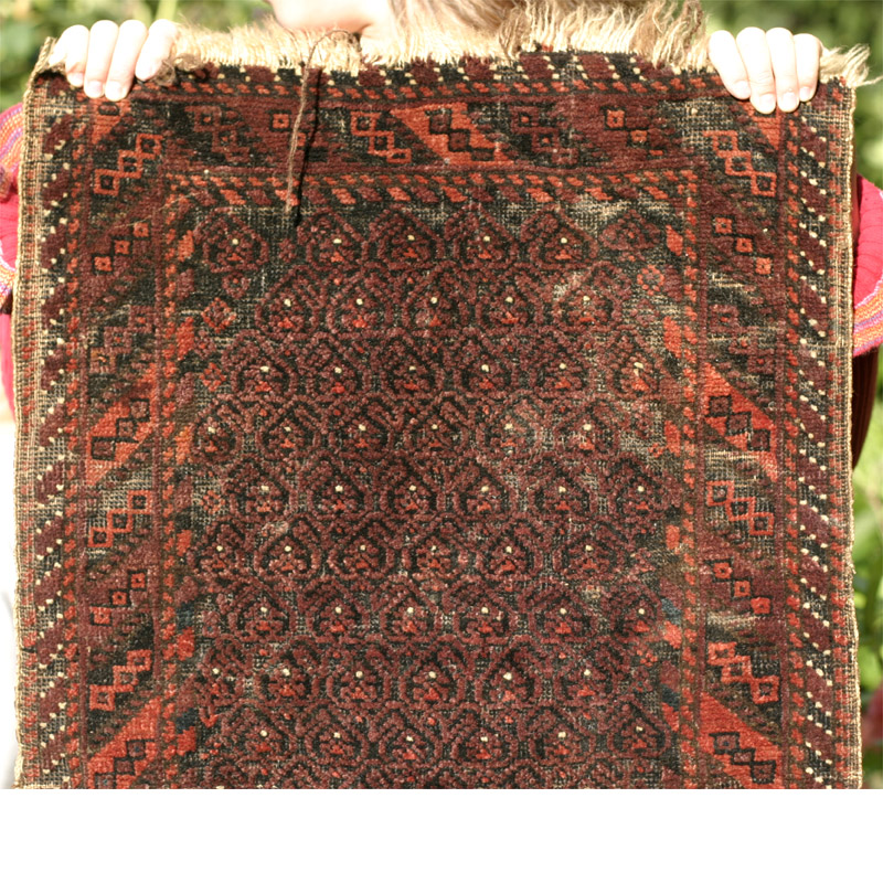 Colour as described under design - all dyes are certainly natural, the overall the appearance is dark, as often with Baluch rugs and bags, but the contrast between aubergine and the dark green ground in the intricate boteh pattern, the varied border, small white highlights and the play of light on the glossy wool pile make this still a lively and interesting weaving.