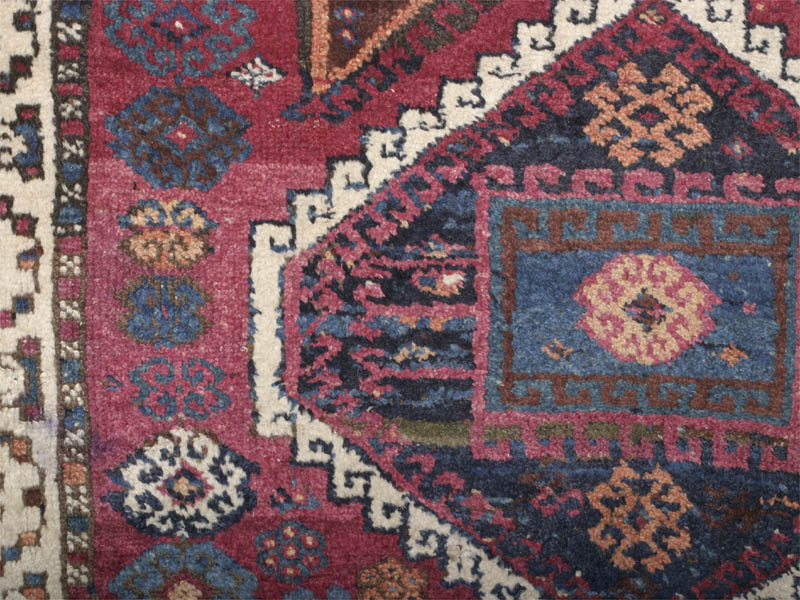 The colors are all saturated and beautiful, they all look natural (apart from 3 very small repairs, see below). The purple red cochineal field (an insect dye) has a beautiful abrash. Cochineal was used a lot instead of madder in eastern Anatolia in the second half of the nineteeth century. Interestingly, blue is absent; instead, we find a range of hues of a beautiful teal (blue-green) that complements the cochineal rather well. The main border has a white background. Eagleton claims for this Gaziantep type that "white borders, which are the most attractive, are the rarest" (text to plate 117). Apart from these three main colours, the cochineal and the teal appear in lighter shades, then there is dark and light apricot, a fine light yellow used sparingly in the filler motifs, and a chestnut brown in the triangular elements ajoining the hexagonal medallions. Outlining is done in dark brown wool, whether from brown sheep or dyed with walnut or similar I cannot tell.