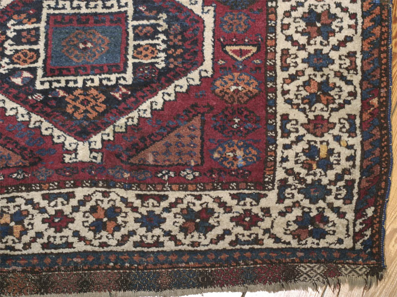 The condition is remarkably good for a rug of this age. There is a full fleecy pile everywhere, only slightly lower in the centre than around the edges. I can detect three small areas of repiling with synthetic dyes, each about a square inch in surface; two can be seen in the pictures. They do not pop out very much, but could be easly repiled with yarn that better matches the original colours. Apart from a very faint grey stain on the right border of the central medallion white outline that I spotted only after considerable exploration, I can see no other stains. The rug is clean and has no odour. It has no tears, holes or kinks, and has nowhere been 'cut and shut'. It lies perfectly flat on the floor.