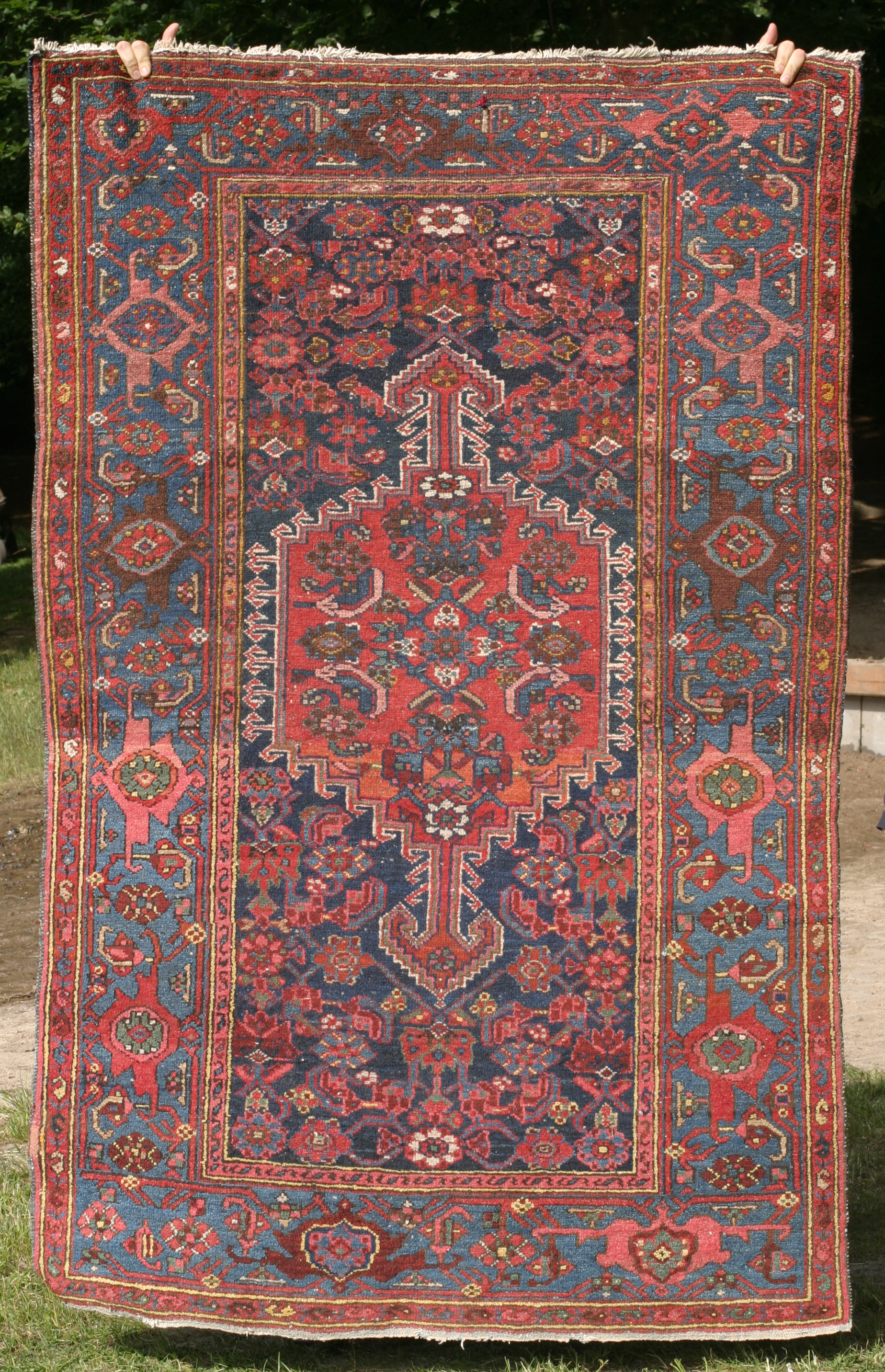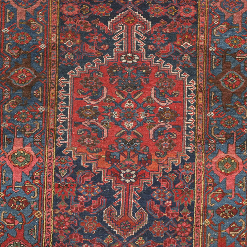 The hexagonal medallion studded with hooks and double hooks, as well as the arrow-shaped medallion pendants are typical design features for Hamadan rugs from the Khamseh area to the north of the city of Hamadan. Particularly attractive is the wide and spaciously drawn blue-ground Herati border (sometimes referred to as 'samovar border').