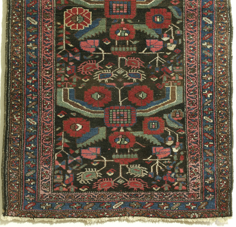 The rug measures 141cm x 97cm (4ft.6in x 3ft.2in.). Symmetrical knotting, Hamadan structure. The knot density is vert. 41/dm and hor. 27/dm, which translates to about 10 knots vertical x 8 knots horizontal, i.e. ca 80 kpsi - quite fine for a Hamadan. The warps are hand-spun (irregular thickness) s-ply cotton, single wefts are of off-white to tan cotton. The wefts in the kilim end are wool. The weave is very tightly packed, leading to a quite high v/h ratio of about 1:1,52. The weave pattern, as already mentioned, seems slightly irregular due to the wefts of varying thickness (probably also handspun). The pile is quite short, perhaps 8mm near the border and very short in the central field. In some areas of the brown ground the pile is down to knot heads, with some white cotton warp knot ends visible.The top end kilim is preserved even with knotted fringe. It shows a characteristic decoration line in blue and red which can also be found in other rugs from the greater Hamadan area (e.g., in rugs attributed to Kolyai, Nahavand, Zaghe and Tuisserkhan in Willborg's book).