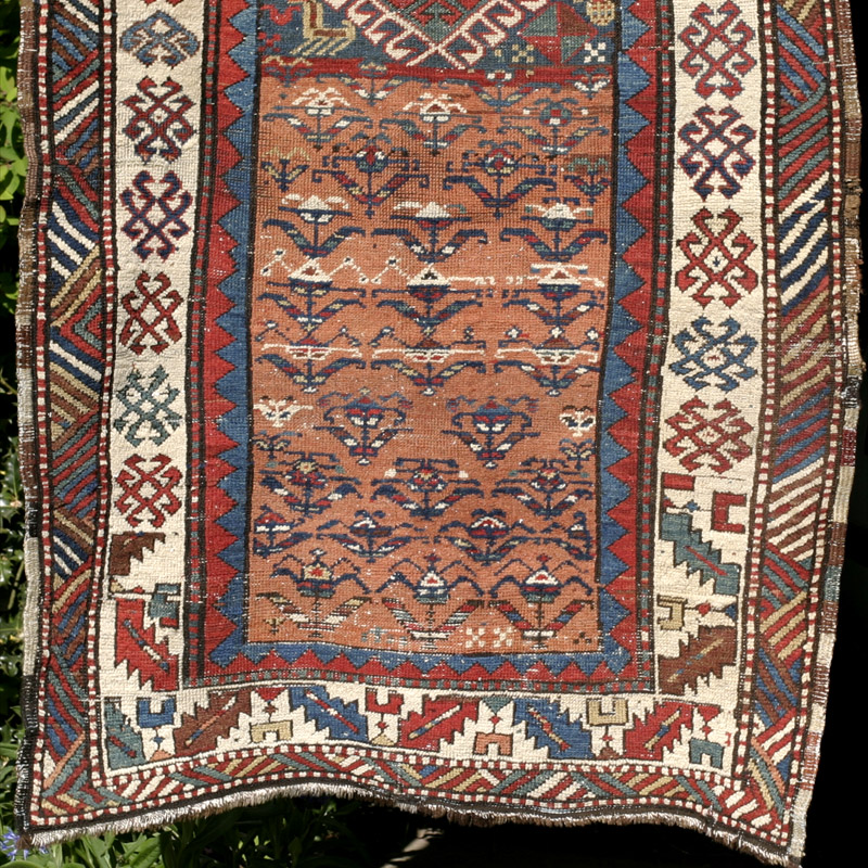 This rug had several holes when I bought it from American ebay vendor antiqueaday who occasionally lists nice rugs, sometimes in a sorry state. Apart form the holes, the pile still seemed OK, and good colours and the unusual design attracted me. I got it restored by Walter Brew of Thunderstrand in the UK, who did a very good job, reweaving the holes in a way that it is difficult to tell where they are even when looking at the back, securing the ends, rewrapping some parts of the selvages, and repiling a few bare areas.