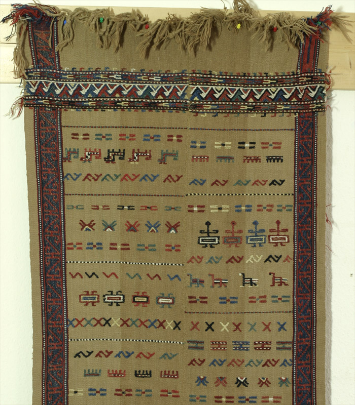 Auf kamelfarbenem Grund (es könnte gut tatsächlich Kamelwolle sein) finden sich Reihen verschiedener abstrakter und figürlicher Musterungen, letztere stellen Menschen, gehörntes Vieh und Vögel dar. Die Muster sind durch zusätzliche Wickelung farbiger Wolle zwischen den Webschüssen eingefügt (extra weft wrapping), also nicht nachträglich bestickt. Die Rückseite zeigt die losen Enden der Musterfäden. Die Farben der wollenen Musterfäden sehen alle nach Naturfarben aus: eine gedecktes Krapprot in einer helleren und einer dunkleren Variante, ein mittelhelles und ein dunkles Indigoblau, ein hübsches Blaugrün, ein Hellgelb, und Weiss. Das Feld wird eingerahmt von hübschen Bordüren: die horizontalen ebenso wie die Feldornamente durch zusätzliche Schusswicklungen, die vertikalen durch eine Kettmusterung.