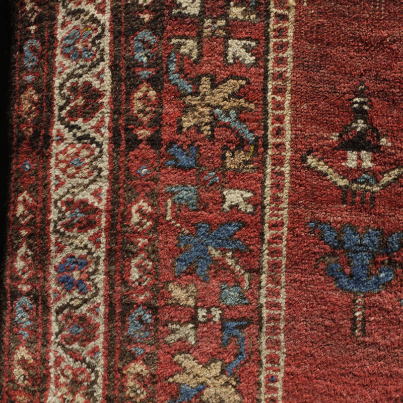 Three outer minor borders (small botehs - Kurdish blossom meander - small botehs) frame the main border which seems influenced by a Caucasian border design found, for example, on Shirvan and Kuba rugs (the 'crab' border). Not executed to perfection, especially in the upper half where the 'crab' motive (probably of floral origin) gets strangely bloated.