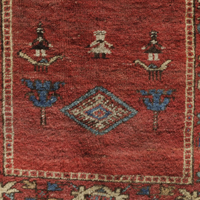 North-West Persian, Kurdish. Difficult to pin down. A rug with one-of-a-kind whimsical design. The narrow width and the slight banana shape point to a tent production. The cotton foundation and the occurence of one hot red which is probably synthetic suggest a production date between 1900–1940.