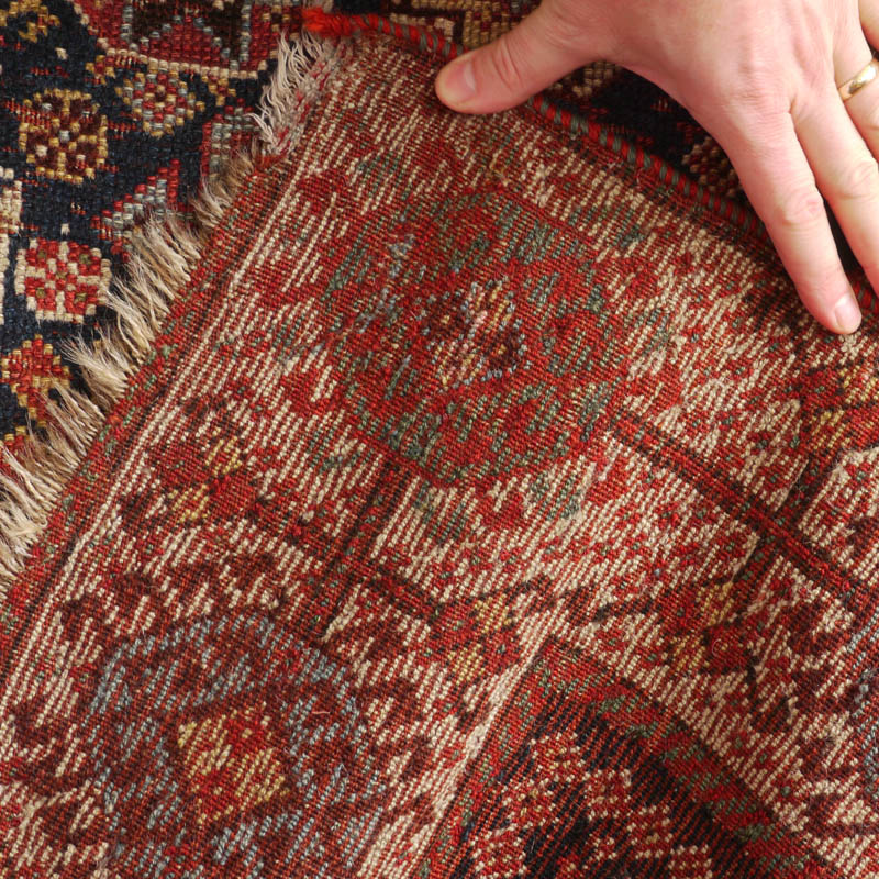 Now, after the reconstruction of the selvedges, structurally sound. No cuts, holes, or brittle areas. The ends have been secured. The pile is short but mostly in good shape; in many places all over the rug, some short lines of knots are worn away (see images). Here, the red wefts becomes visible. Due to the lively pattern and the red colour of the foundation, this is not very distracting.