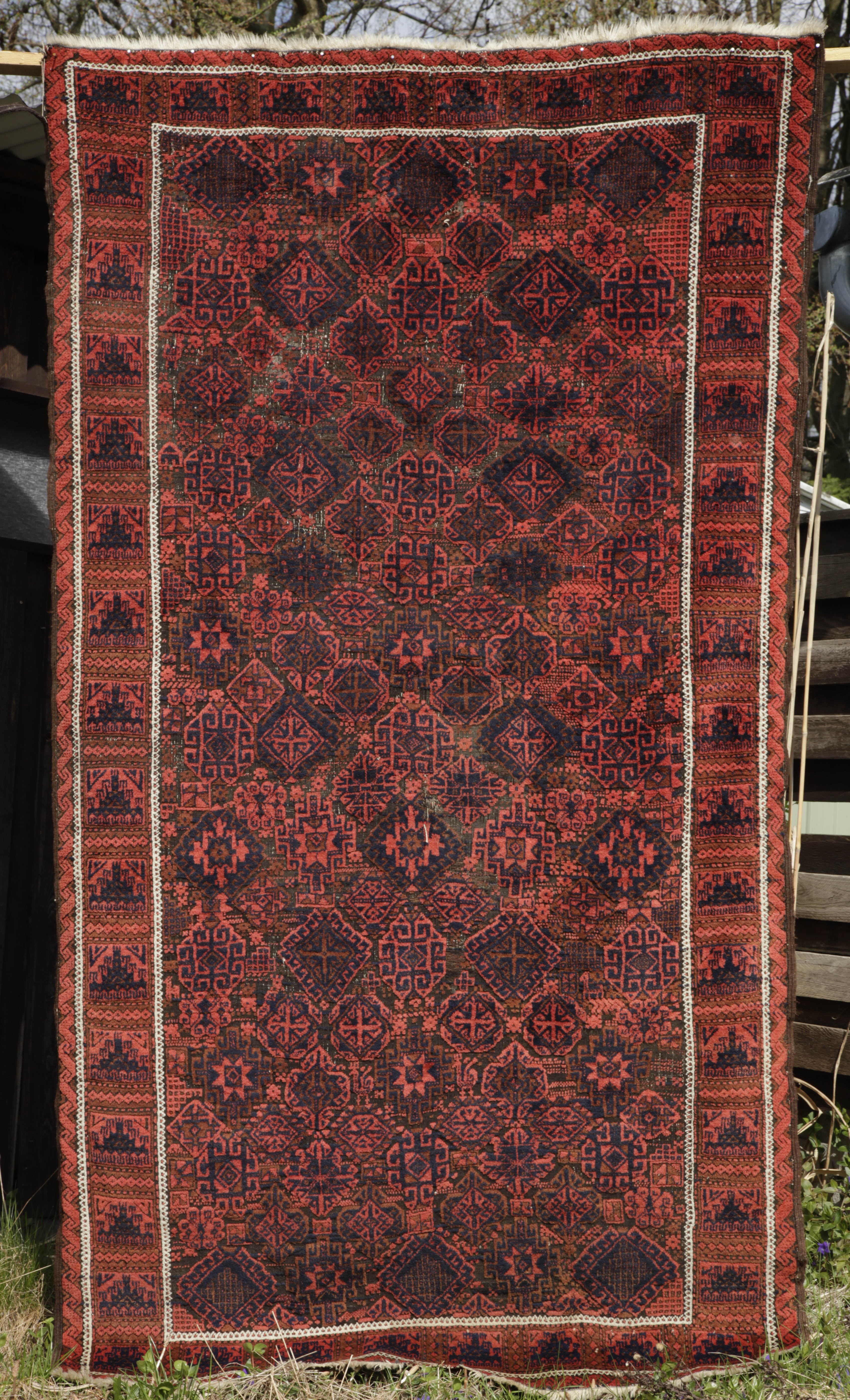 All photos are taken in direct sunlight - compared to earlier attempts, it is now visible that the blues are truly dark blue and not black, and that the reds are well saturated and neither pinkish nor murky. Nothing more fiendish to photograph than a Baluch type rug. (I recommend staying 1-2 stops below the readings of your built-in light meter, and the colours may *just* look right (never completely).