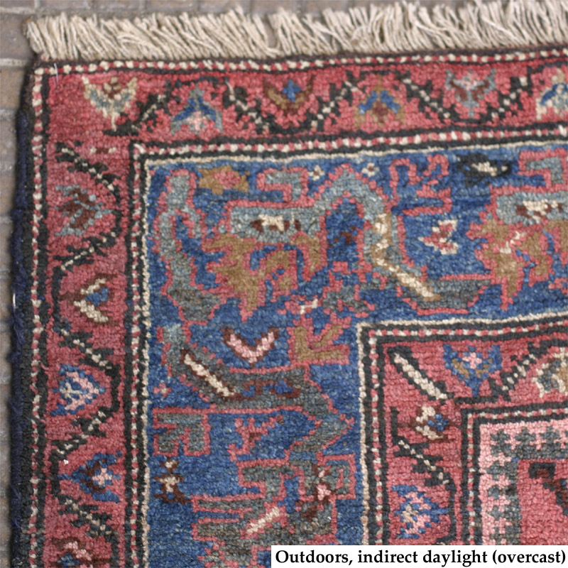 The rug is in excellent full pile condition, no holes, tears, moth damage etc. About 12 inches of the top-left outer border are repair work, well done and blending in nicely with the rest. The ends are professionally secured, the selvages (wrapped in blue wool) are in good shape with one very minor damage, hardly noticeably and easily repaired.
