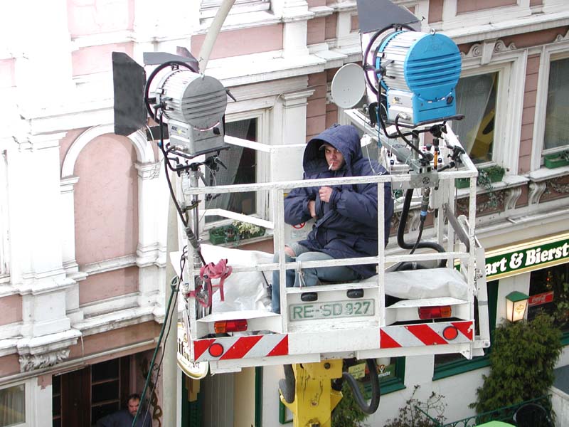 The area where I [used to] live must be one of the most filmed in Germany. We have film crews outside at least once a week, often for several days. My immediate reaction is to curse them since they make such a fuss, blocking off the roadside for their trucks and caravans, handling pegs, unfolding their gear, laying tracks for camera movements, gesturing at people with walkie-talkie in hand. These film people with their pony tails, shades, baseball hats, smart casual jackets, kit and script and lamps and blue foil and orange foil and reflectors, assembling leisurely to space-hugging groups, smoking - they seem to feel so important. They have even learned to ignore bystanders, go about their business while soaking up the envious gazes directed at them - the lion in the jungle who cannot be prey. Knowing then that the output will be a new sequel to some dim German police series where again the script demanded that some trace had to be followed into the red-light district, where you need the seedy, the derilict, or even the faded political flavour of the Hafenstrasse houses next door, makes all this effort seem pathetic, ridiculous. Next I remember that I have been part of this business - although mostly at the cheapo independent side. So I remind me not to hate my past and therefore, to be tolerant. Then I thought why not turn to photographing these people? I remembered the division between being on the set / being outside the set - where you miss all the thrills or fun bits, where the food and the working hours are worse. For one movie I worked on preparing the sets, making up science fiction displays, joining, fiddling, cleaning, painting, spreading rubbish from the back of a pickup in a disused Motorway tunnel and in port area streets, scratching it off the wet tarmac by hand after the shooting, at dusk. I remember flimsy coffee cups with stale lukewarm coffee, social smoking, endless waiting, irritation at rumours that someone or something had fucked up which meant we had to re-do things, or stay longer before being able to go to sleep. I remember working indoors, in a deliberately soiled bar, beer-soaked carpet covered with cigarette tips, bits of broken glass, at 35 degrees Celsius. The director Emigholz needed an aperture of 8 for sufficient depth of field which meant lots of lighting that turned the narrow unventilated room turned into a stinking hell. I remember painful skin rashes, series of working days that took 17 hours, and getting ill as the effect of all this. I believe the resulting film was The holy bunch.